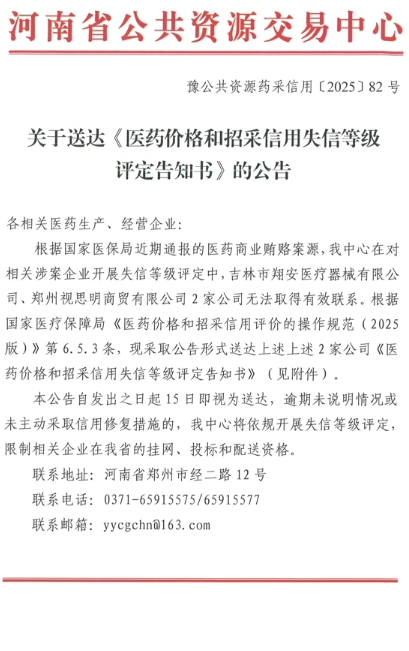 關于送達醫(yī)藥價格和招采信用失信等級評定告知書的公告