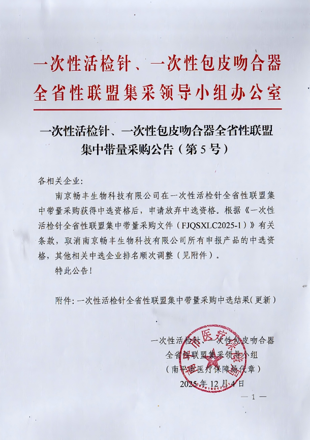 各相關(guān)企業(yè): 南京暢豐生物科技有限公司在一次性活檢針全省性聯(lián)盟集中帶量采購(gòu)獲得中選資格后,申請(qǐng)放棄中選資格。根據(jù)《一次性活檢針全省性聯(lián)盟集中帶量采購(gòu)文件(FJQSXLC2025-1)》?有關(guān)條款,取消南京暢豐生物科技有限公司所有申報(bào)產(chǎn)品的中選資格,其他相關(guān)中選企業(yè)排名順次調(diào)整(?見附件)?. 特此公告!